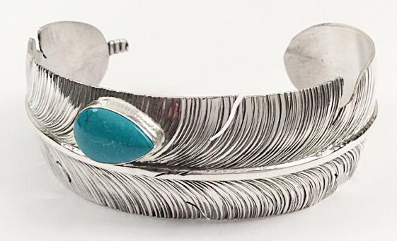 Home / BRACELETS / Navajo Ben Begay Silver Feather Cuff With Turqouise Stone Navajo Ben Begay Silver Feather Cuff With Turqouise Stone$400.00 Navajo Ben Begay Silver Feather Cuff With Turqouise Stone quantity Add to cart SKU: R18-BR35 Category: BRACELETS Tags: Ben Begay, Feather Description Description 5 3/4″ x 1″ Related products EARRINGS Navajo Ben Begay Feather Earrings with Turquoise Stone PENDANTS Navajo Jeff Henio Silver Bear with Feather Pendant PENDANTS Navajo Ben Begay Large Silver Feather with Turqouise Stone PENDANTS Navajo Aaron Davis Silver Feather Pendant