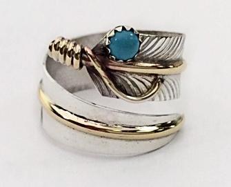 Home / RINGS / Navajo Chris Charley Silver Feather Ring with TQ Stone and Brass Trimming Navajo Chris Charley Silver Feather Ring with TQ Stone and Brass Trimming$84.50 Navajo Chris Charley Silver Feather Ring with TQ Stone and Brass Trimming quantity Add to cart SKU: R18-R44 Category: RINGS Tags: Adjustable, Chris Charley, Feather Description Description 3/8″ W Related products PENDANTS Navajo Ben Begay Medicine Wheel Pendant EARRINGS Double Feather Earrings PENDANTS Navajo Ben Begay Round Pendant with 2 Feathers and Turqouise Stone PENDANTS Navajo Aaron Davis Silver Feather with Turqouise Stone