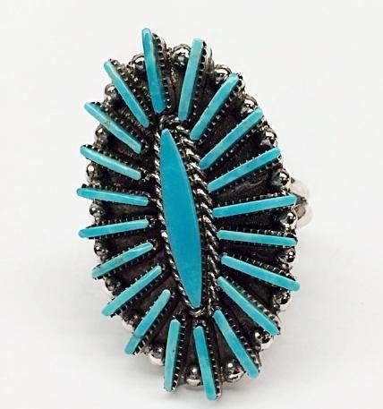 Home / RINGS / Zuni Carla Laconsello Needle Point Cluster Ring Zuni Carla Laconsello Needle Point Cluster Ring$250.00 1 3/8″ x 13/16″ Zuni Carla Laconsello Needle Point Cluster Ring quantity Add to cart SKU: R18-R200 Category: RINGS Tags: Carla Laconsello, Cluster, Needle Point Description Description 1 3/8″ x 13/16″ Related products PENDANTS Zuni Evangeline Wyaco Needle Point Cluster Pendant PENDANTS Kingman Turquoise Cluster Pendant PENDANTS Zuni Labar Tsethlikai James Turquoise or Coral Pendant PENDANTS Navajo Tina Jones Turqouise Cluster Pear Pendant